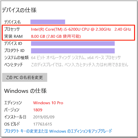 [Windowsの仕様]で、お使いのデバイスで実行中のWindowsのエディションとバージョンを確認します。